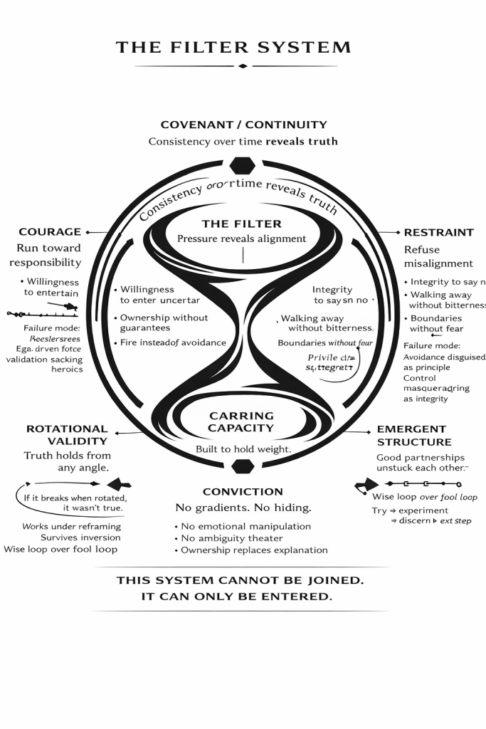 What sits at the center of this passage is not an ending, but a filter. It’s not a gate that keeps people out, but a process that reveals what is actually there. The filter is tested in two opposite directions at once. On one side is the willingness to run into the fire, to take responsibility, to act without guarantees. On the other side is the integrity to say “I’m not into this,” even when the cost is loss of opportunity, belonging, or praise. Most people fail one side or the other. Some want to be used, because approval feels like safety. Others refuse everything, because distance feels like control. Very few can step forward without needing validation and step back without fear of being discarded. That capacity is what we call trust.